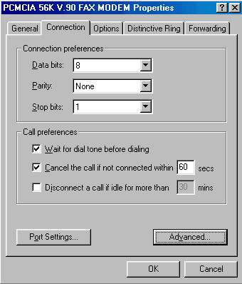 Next select the Configure option under the modem on the General tab. Then select configure from the options at the top of the next window, then select Advanced down the bottom of the next window.