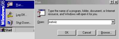 Select "Start" then Select "Run" from the Start Menu. Type "inetwiz" into the run field and Select "OK"