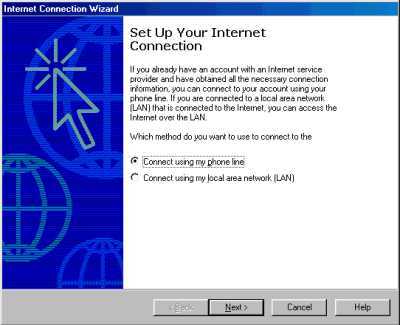 On the Internet connection wizard screen that asks for the method you use to connect,